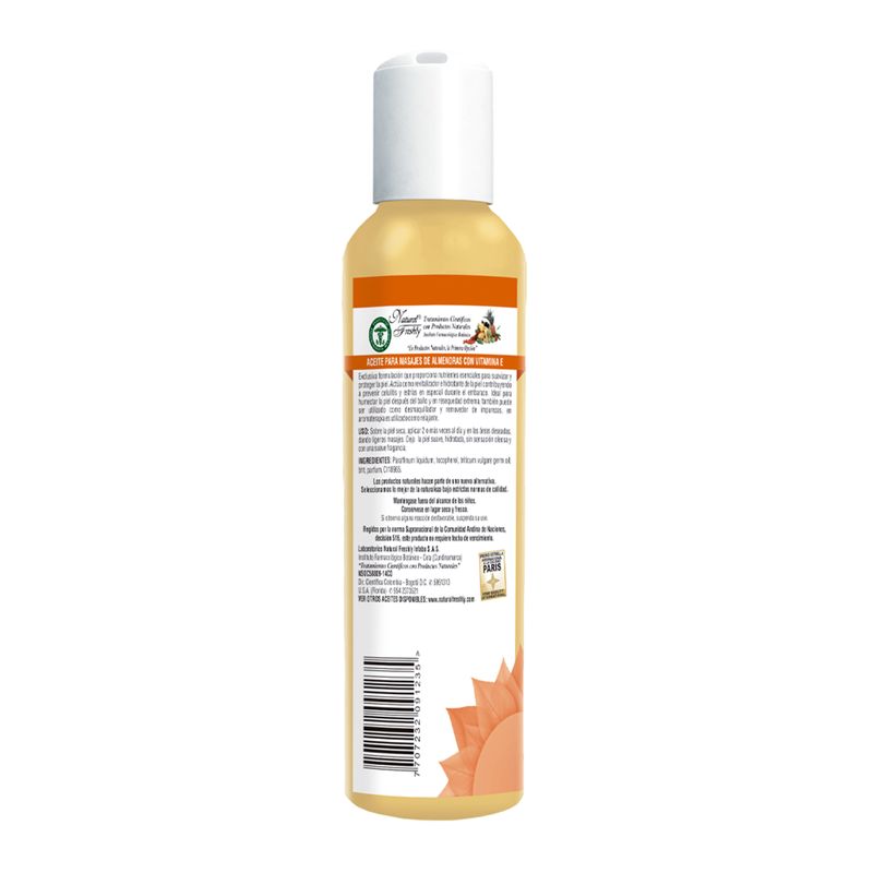 Aceite de almendras natural en frasco de 240 ml. Ideal para el cuidado de la piel y el cabello.