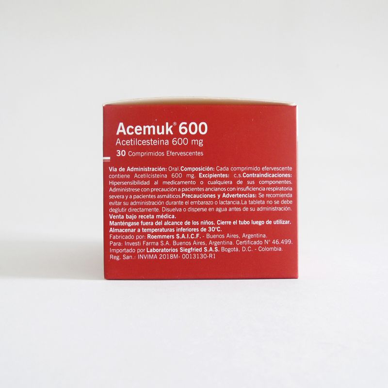 Acemuk Efervescente Acetilcisteina 600 Mg Caja X 30 Tabletas Siegfried. Este producto es un medicamento, no exceder su consumo. Leer indicaciones y contraindicaciones, si los síntomas persisten consultar al médico. Venta bajo fórmula médica.
