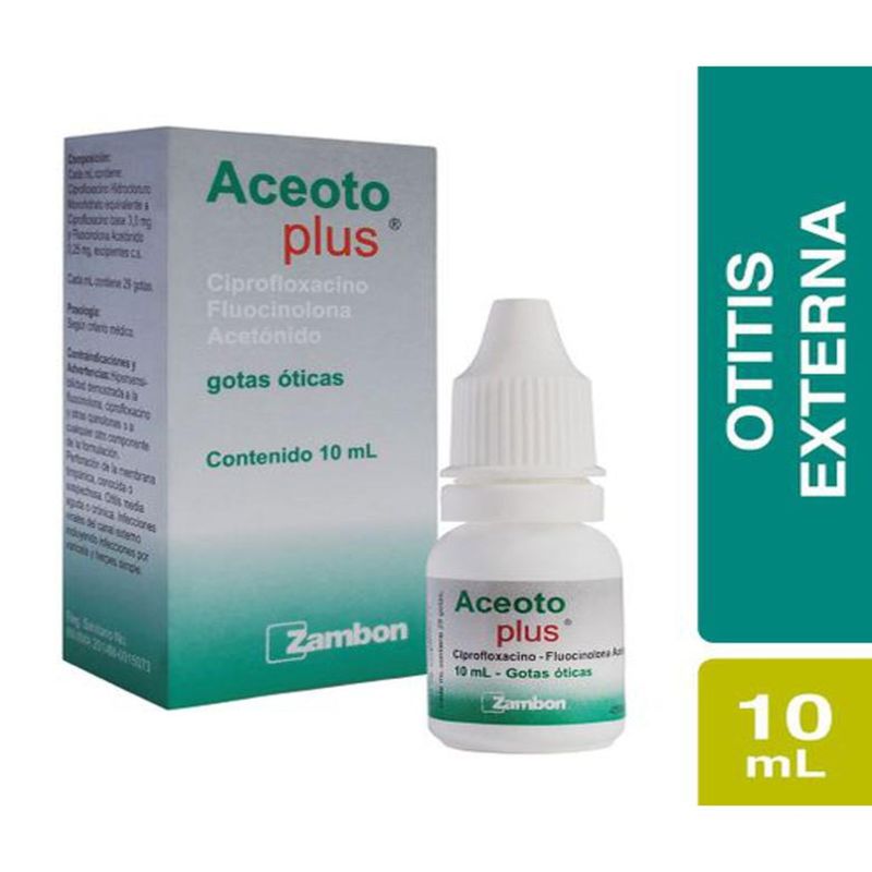 Aceoto Plus Solución Otica Ciprofloxacino 3 Mg Fluocinolona Acetónido 0.25 Mg Frasco X 10 Ml Zambon. Este producto es un medicamento, no exceder su consumo. Leer indicaciones y contraindicaciones, si los síntomas persisten consultar al médico. Venta bajo fórmula médica.