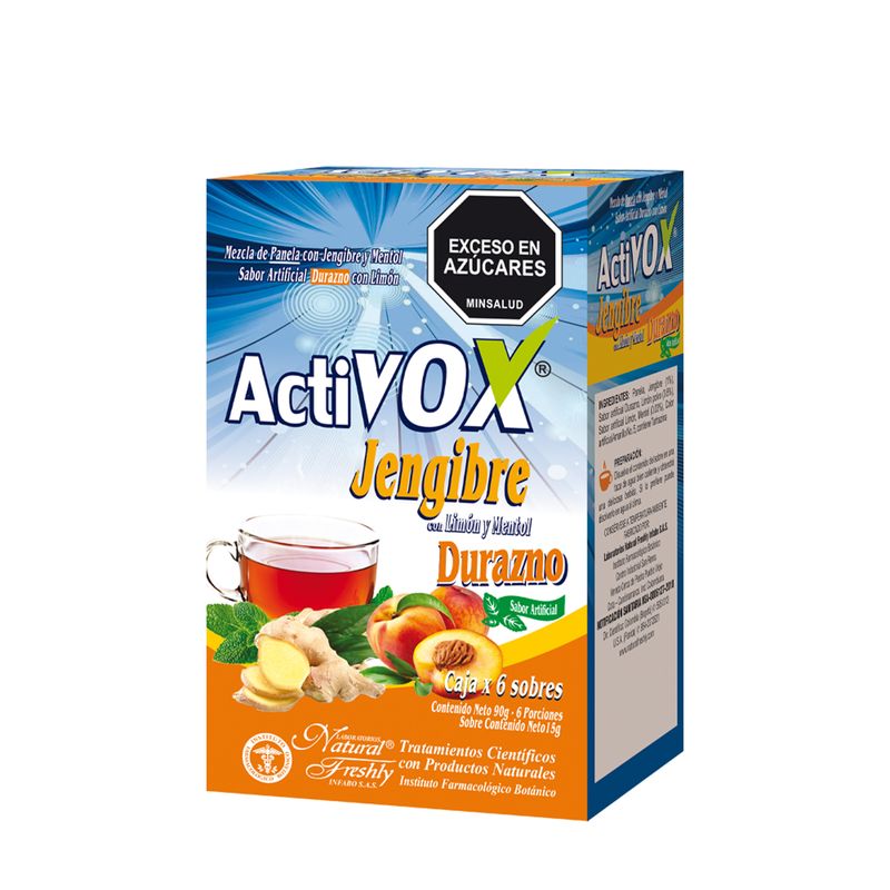 Activox Jengibre Durazno, caja con 6 sobres, ideal para disfrutar de una bebida refrescante.