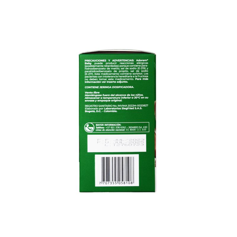 Adorem Baby Acetaminofén 3,2Gr/100Ml Jarabe Frasco X 60 Siegfried. Este producto es un medicamento, no exceder su consumo. Leer indicaciones y contraindicaciones, si los síntomas persisten consultar al médico.