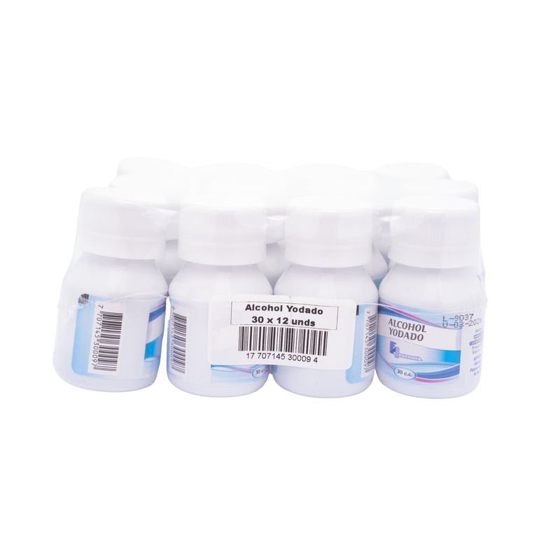 Alcohol yodado en frasco de 30 cc, paquete de 12 unidades. Ideal para desinfección.