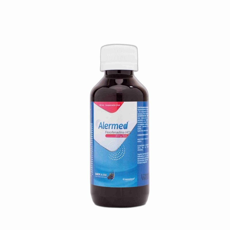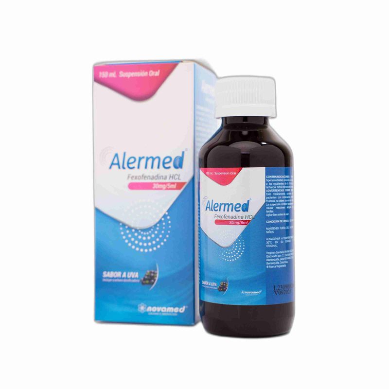 Alermed Fexofenadina Clorhidrato Frasco X 150 Ml Suspensión Oral Novamed. Este producto es un medicamento, no exceder su consumo. Leer indicaciones y contraindicaciones, si los síntomas persisten consultar al médico.