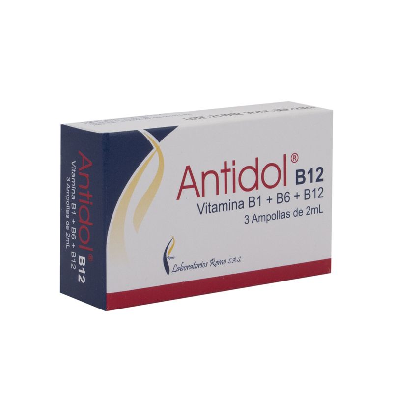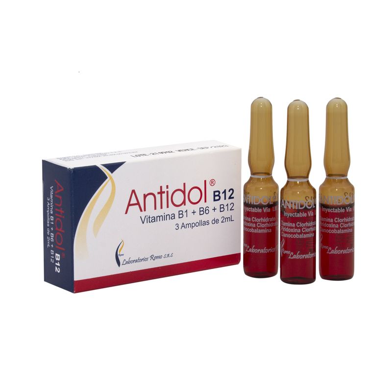 Antidol B 12 Caja X 3 Ampollas Mk Remo. Este producto es un medicamento, no exceder su consumo. Leer indicaciones y contraindicaciones, si los síntomas persisten consultar al médico. Venta bajo fórmula médica.
