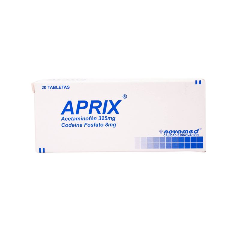 Aprix F Acetaminofén Codeina Fosfato 325 Mg/8 Mg Caja X 20 Tabletas Novamed. Este producto es un medicamento, no exceder su consumo. Leer indicaciones y contraindicaciones, si los síntomas persisten consultar al médico. Venta bajo fórmula médica.