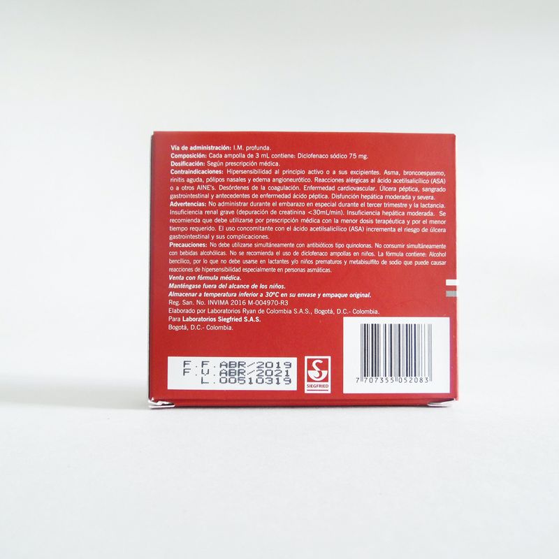 Artrites Diclofenaco Sódico 75 Mg Caja X 5 Ampollas Solución Inyectable Siegfried. Este producto es un medicamento, no exceder su consumo. Leer indicaciones y contraindicaciones, si los síntomas persisten consultar al médico. Venta bajo fórmula médica.
