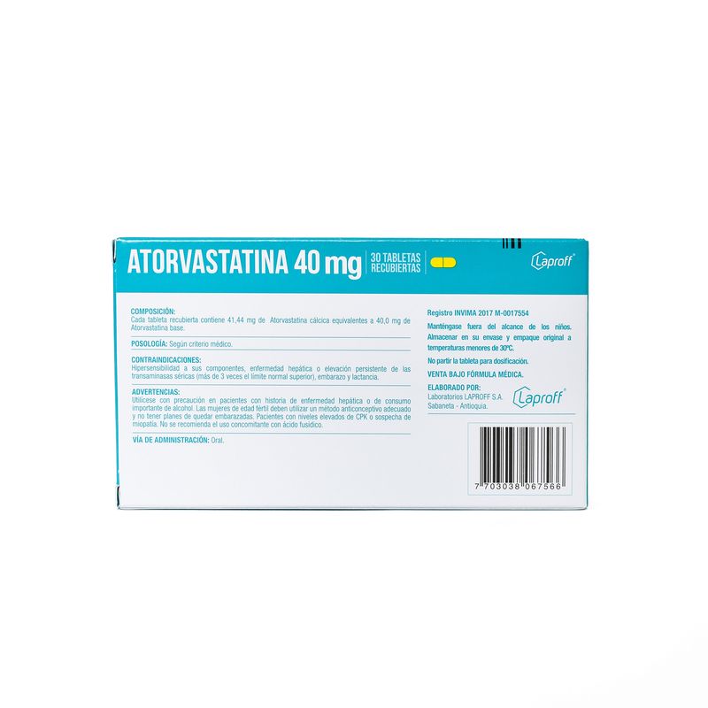 Atorvastatina 40 Mg Caja X 30 Tabletas Laproff. Este producto es un medicamento, no exceder su consumo. Leer indicaciones y contraindicaciones, si los síntomas persisten consultar al médico. Venta bajo fórmula médica.