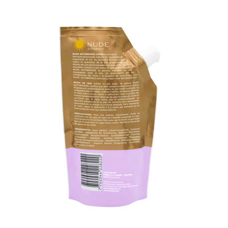 Auto Bronceador Líquido Nude Doypack Frasco X 200Ml Prebel. Proporciona un brillo dorado y natural, realzando tu tono de piel. Formulado con ingredientes hidratantes, ayudando a lograr un bronceado radiante sin dañar la piel.
