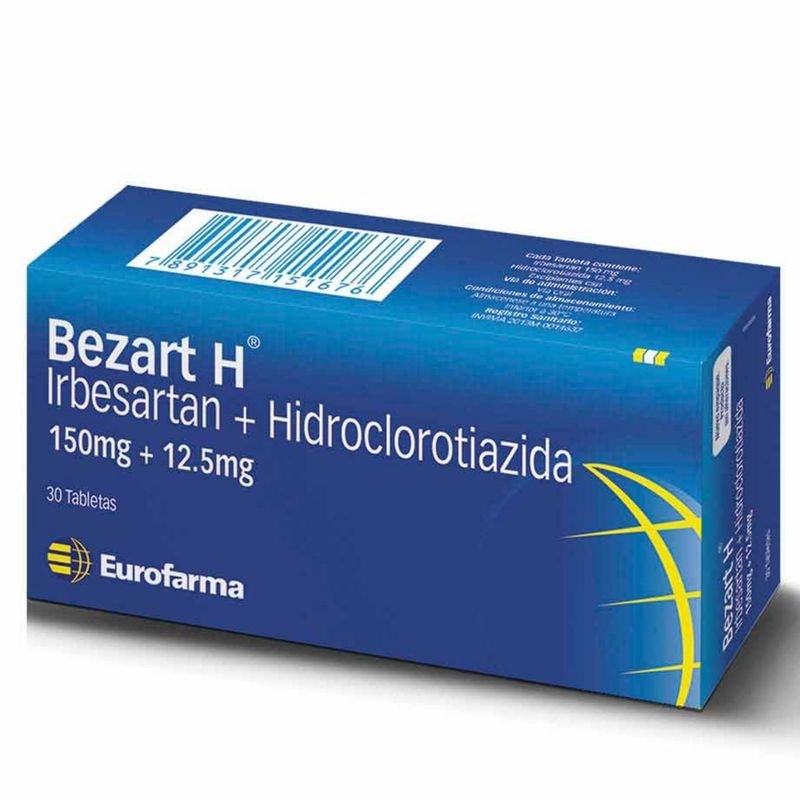Bezart Hidroclorotiazida Irbesartán 150 mg + 12.5 mg de Eurofarma, en una caja con 30 tabletas, es una combinación de medicamentos para el tratamiento de la hipertensión arterial. Combina un bloqueador de los receptores de angiotensina II (irbesartán) con un diurético (hidroclorotiazida) para un control más eficaz de la presión sanguínea.