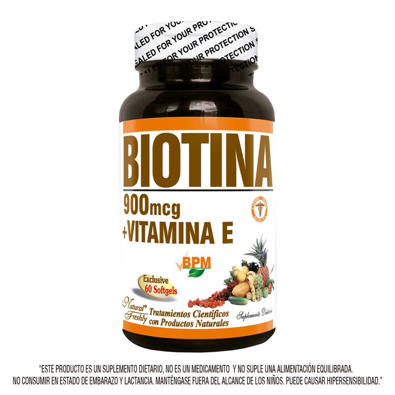 Biotina 900 Mcg + Vitamina E Frasco X 60 Cápsulas Este suplemento está formulado para apoyar la salud del cabello, la piel y las uñas. Contiene 900 mcg de biotina, una vitamina B esencial para la producción de queratina, y vitamina E, un antioxidante que puede proteger las células del daño. Su presentación en frasco de 60 cápsulas proporciona un suministro de dos meses.