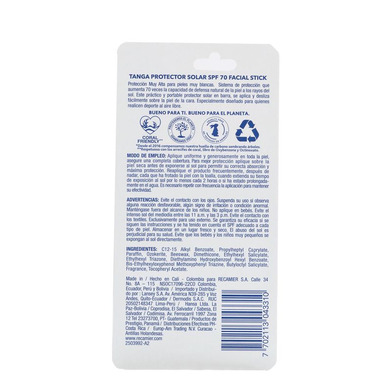 Bloqueador Tanga Spf 70 Barra Corporal Y Facial 13 Gr Recamier. Formulado para proteger tu piel de los dañinos rayos UV. Con texturas ligeras y de rápida absorción, ofrece una protección eficaz mientras hidratan y suavizan la piel.
