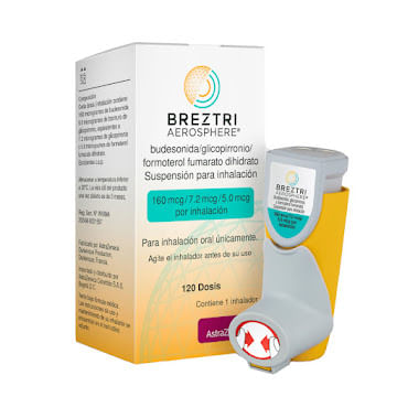 Breztri Aerosphere Budesonida-Glicopirronio-Formoterol Inhalador Caja X 120 Dosis Zeneca Este producto es un medicamento, no exceder su consumo. Leer indicaciones y contraindicaciones, si los síntomas persisten consultar al médico. Venta bajo fórmula médica.