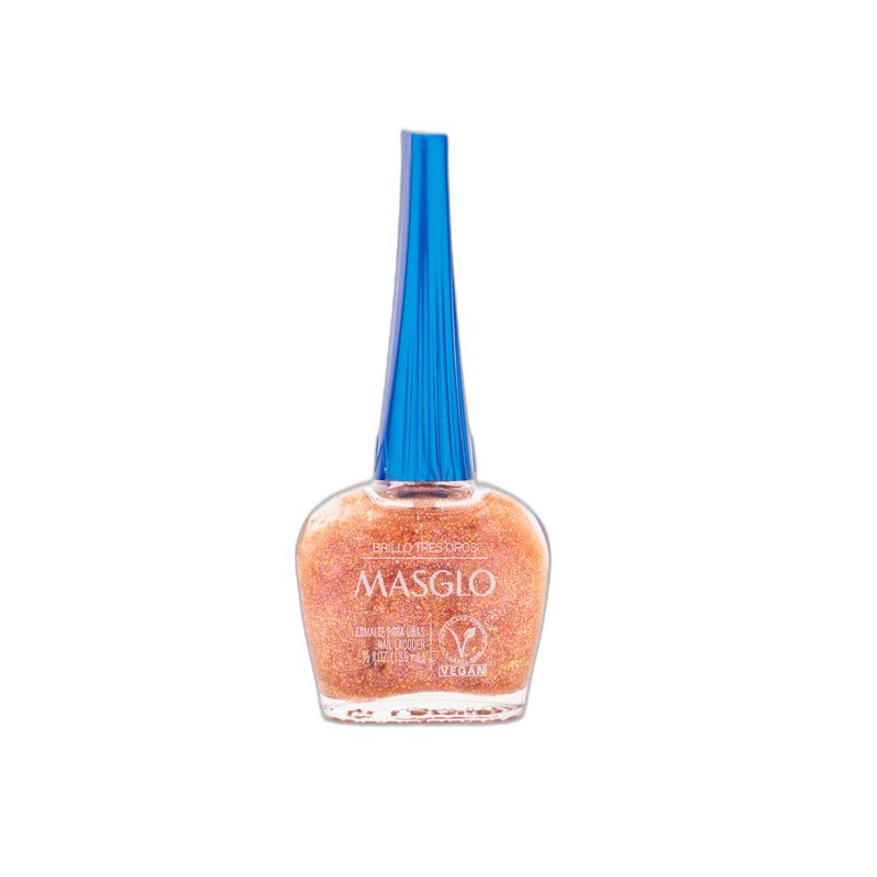 Brillo Masglo Tres Oros en frasco de 13.5 ml es un top coat de lujo que infunde a tus uñas con un resplandor dorado. Sus