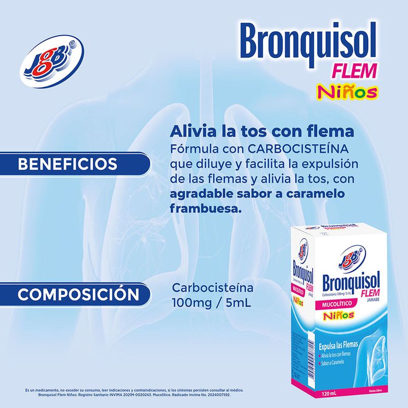 Bronquisol Niños Flem Carbocisteina 5 Gr Jarabe Frasco X 120 Ml Jgb. Este producto es un medicamento, no exceder su consumo. Leer indicaciones y contraindicaciones, si los síntomas persisten consultar al médico.