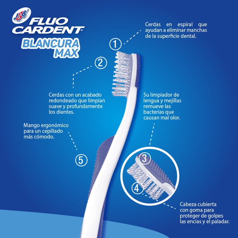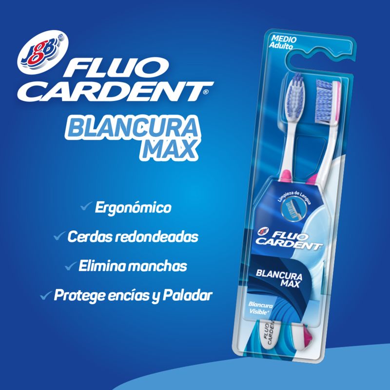 Cepillo Dental Fluocardent Blancura Max Pack 2 Unidades. Cepillo que ayuda a mantener la blancura dental, ideal para uso diario.