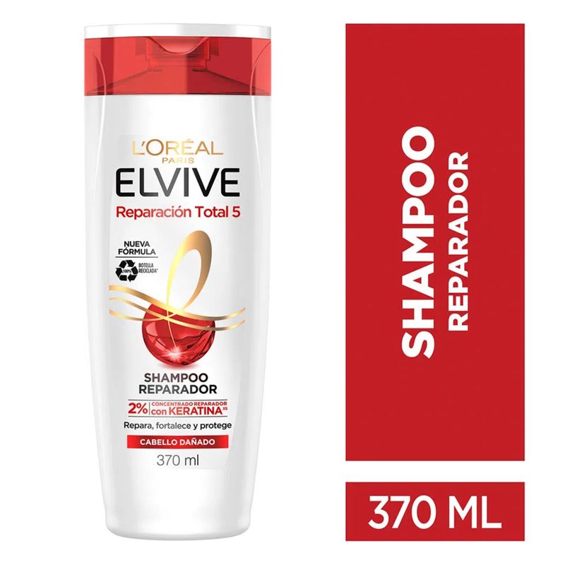 Shampoo Elvive Reparacion Total Frasco X 370 Ml Loreal. Elimina impurezas y residuos, dejando el cabello fresco y limpio, proporciondo una hidratación profunda, desenredando y fortaleciendo cada hebra.