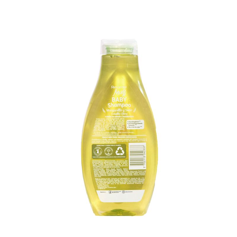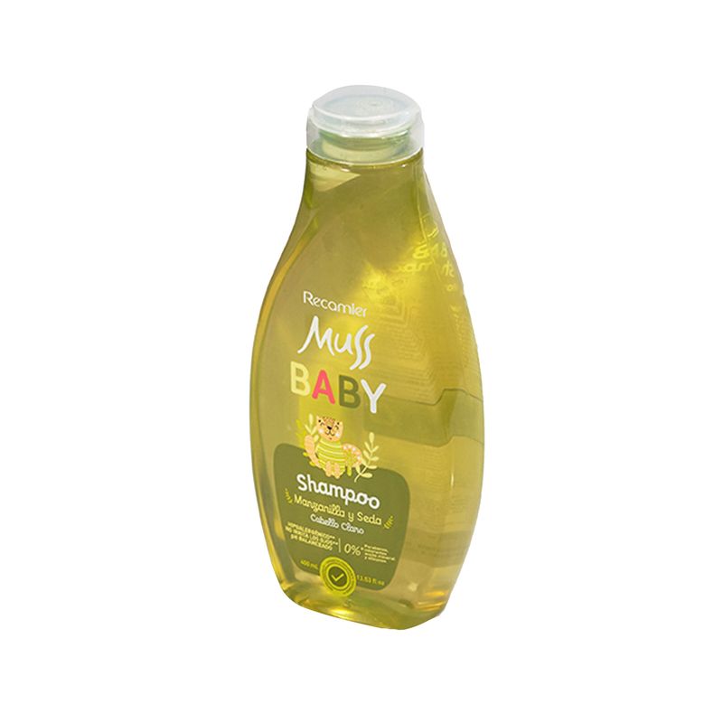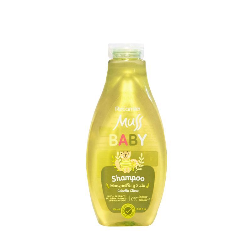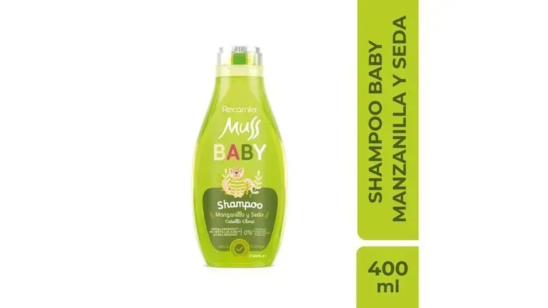 Shampoo Muss Baby Manzanilla Frasco X 400 Ml Recamier. Proporciona una hidratación profunda y reparando el daño. Su textura cremosa se desliza fácilmente, desenredando el cabello y dejándolo sedoso y brillante.