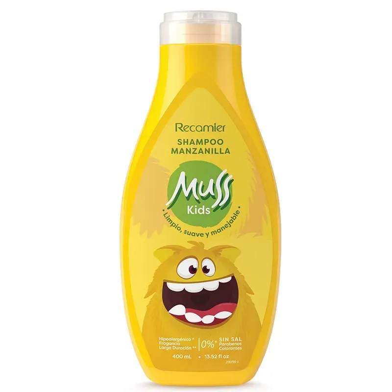 Shampoo Muss Kids Manzanilla Frasco X 400Ml Recamier. Proporciona una hidratación profunda y reparando el daño. Su textura cremosa se desliza fácilmente, desenredando el cabello y dejándolo sedoso y brillante.