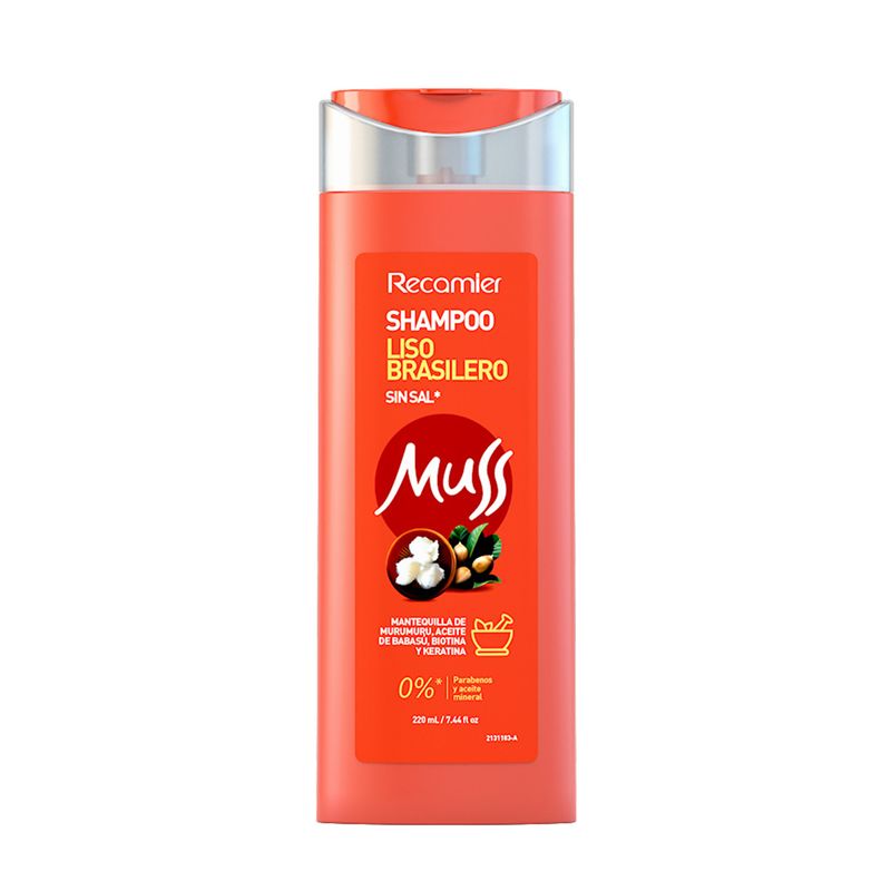 Shampoo Muss Liso Brasilero 220 Ml Recamier. Elimina impurezas y residuos, dejando el cabello fresco y limpio, proporciondo una hidratación profunda, desenredando y fortaleciendo cada hebra.