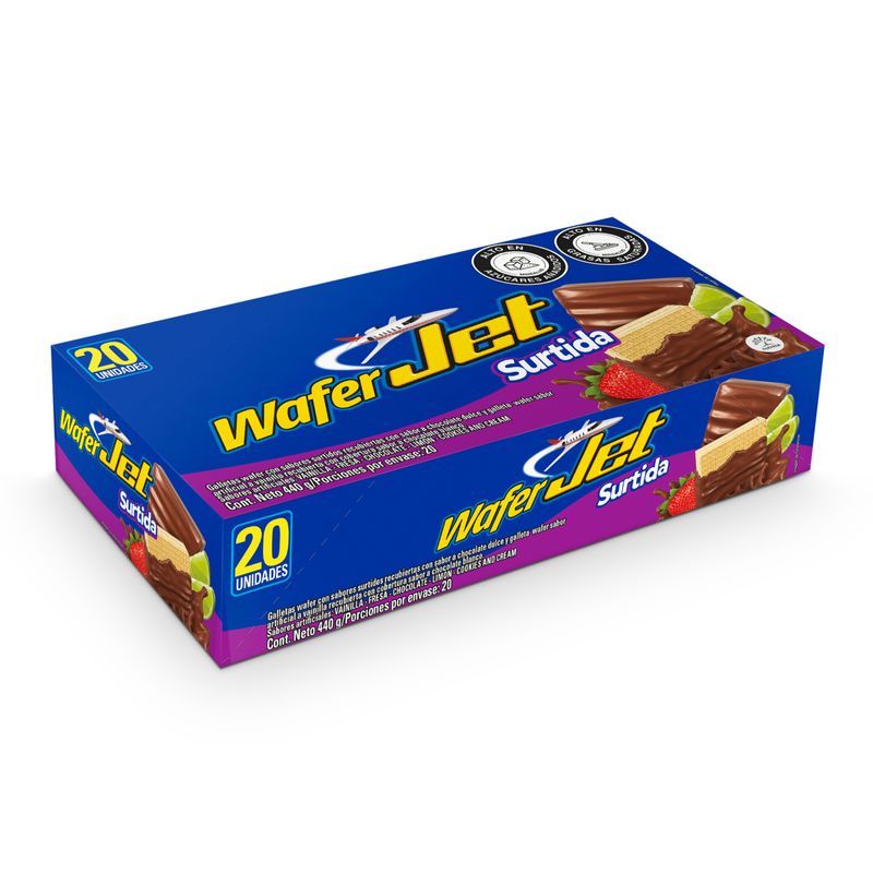 variedad de sabores de Wafer Jet en una presentación práctica. Cada barra es una combinación crujiente de oblea y chocolate, ideal para un snack delicioso y versátil.