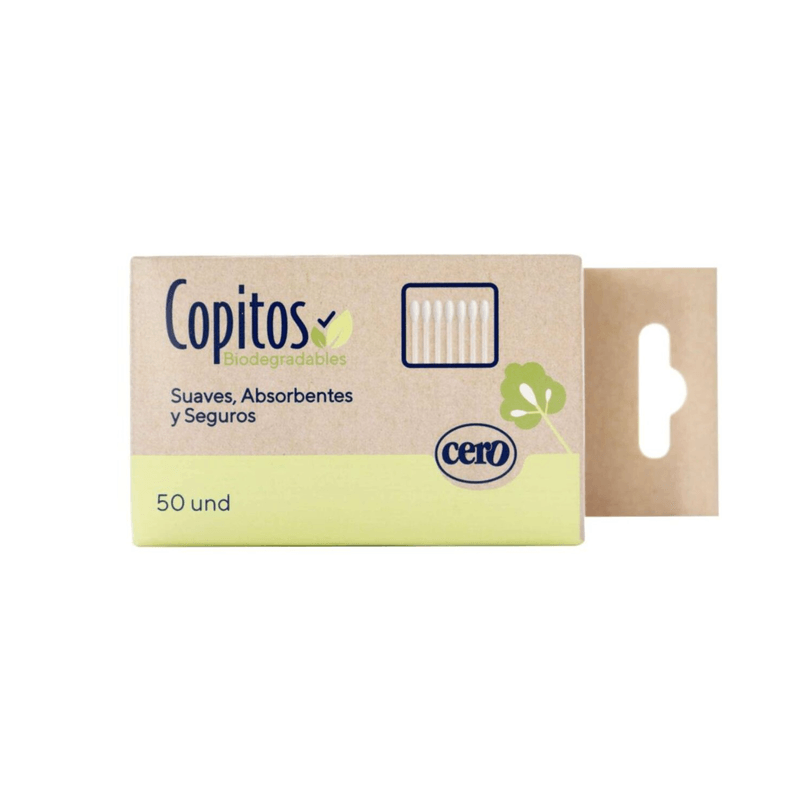 Copitos Cero Biodegradable Caja X 50 Unidades Cero Los Copitos Cero son bastoncillos de algodón biodegradables, diseñados para la higiene personal de forma sostenible. Su presentación en caja de 50 unidades ofrece una opción ecológica para el cuidado diario en una cantidad menor.