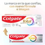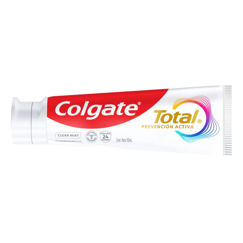 Mantén una buena higiene bucal con la Crema de dientes anti caries Colgate Total Clean Mint con Prevención Activa, la nueva versión de Colgate Total, que combate bacterias que son la causa raíz de los problemas bucales como: bacterias en encías, erosión de esmalte, placa dental, sarro dental, mal aliento y caries. La crema dental Colgate Total te ofrece hasta 24 horas** de protección antibacterial. Previene los problemas bucales más comunes antes de que aparezcan gracias a su nueva fórmula de desempeño superior**** y tecnología poderosa, patentada*** y preventiva. Si quieres prevenir la caries dental, la placa o evitar las manchas en los dientes, esta crema Colgate es la indicada, ya que contiene flúor que ayuda a la prevención de caries y fortalece el esmalte. Úsala con el cepillo de dientes Colgate Total y el enjuague bucal Colgate Total para una limpieza profunda y una protección bucal completa. Luce una sonrisa saludable en todo momento con la crema dental Colgate Total Clean Mint. **Con el cepillado 2 veces por día y uso continuo por 4 semanas ***Patentada en Estados Unidos. ****Vs crema de dientes regular con flúor sin ingrediente antibacterial