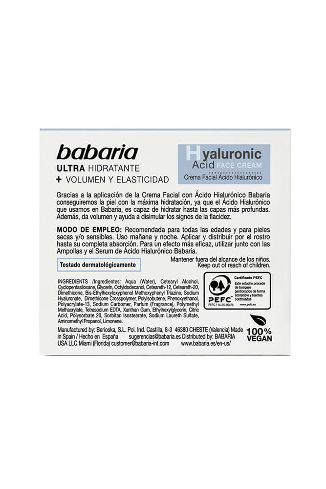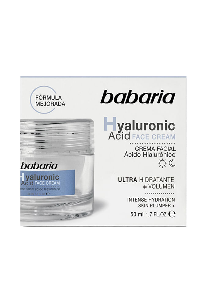 La Crema Facial Babaria Ácido Hialurónico en frasco de 50 ml es una