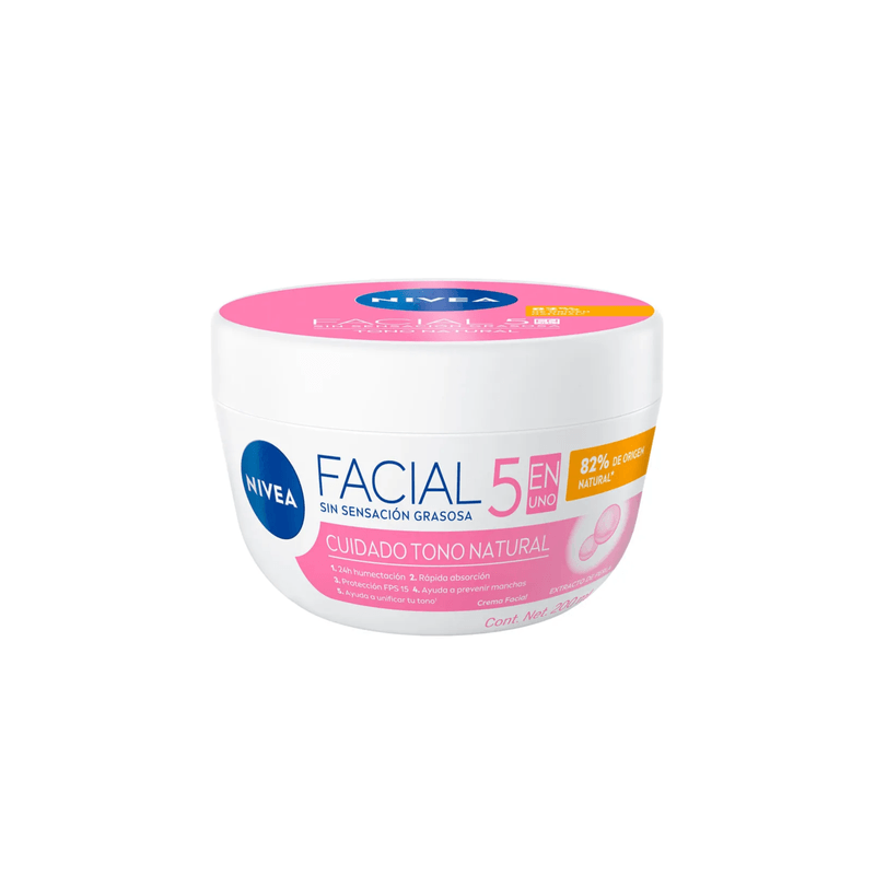 Crema Facial Nivea Tono Natural 5 en 1 x 200ml es una crema facial de la marca Nivea que ofrece cinco beneficios en un solo producto, además de ayudar a unificar el tono natural de la piel. Viene en una presentación de 200 ml.