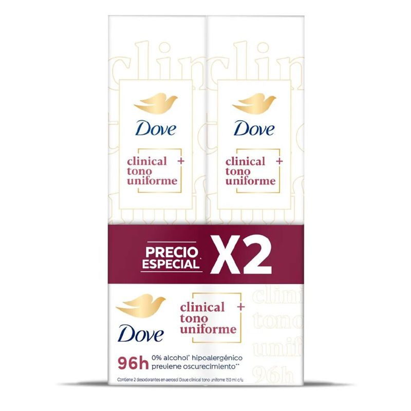 Desodorante Dove Aerosol Mujer Clinical 2x150 Ml El Desodorante Dove Aerosol Mujer Clinical está formulado para proporcionar una protección antitranspirante de nivel clínico contra el sudor y el mal olor, incluso en situaciones de estrés o actividad intensa. Su fórmula suave cuida la piel de las axilas. Este pack incluye dos aerosoles de 150 ml cada uno.