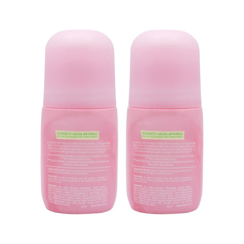 Desodorante Elizabeth Arden Naturals, presentación promocional de 2 frascos de 50 ml cada uno. Formulación diseñada para la protección contra el mal olor corporal, elaborada con ingredientes de origen natural. Su presentación en frasco facilita la aplicación. Esta promoción ofrece un valor añadido para los consumidores de desodorantes naturales en droguerías y farmacias.