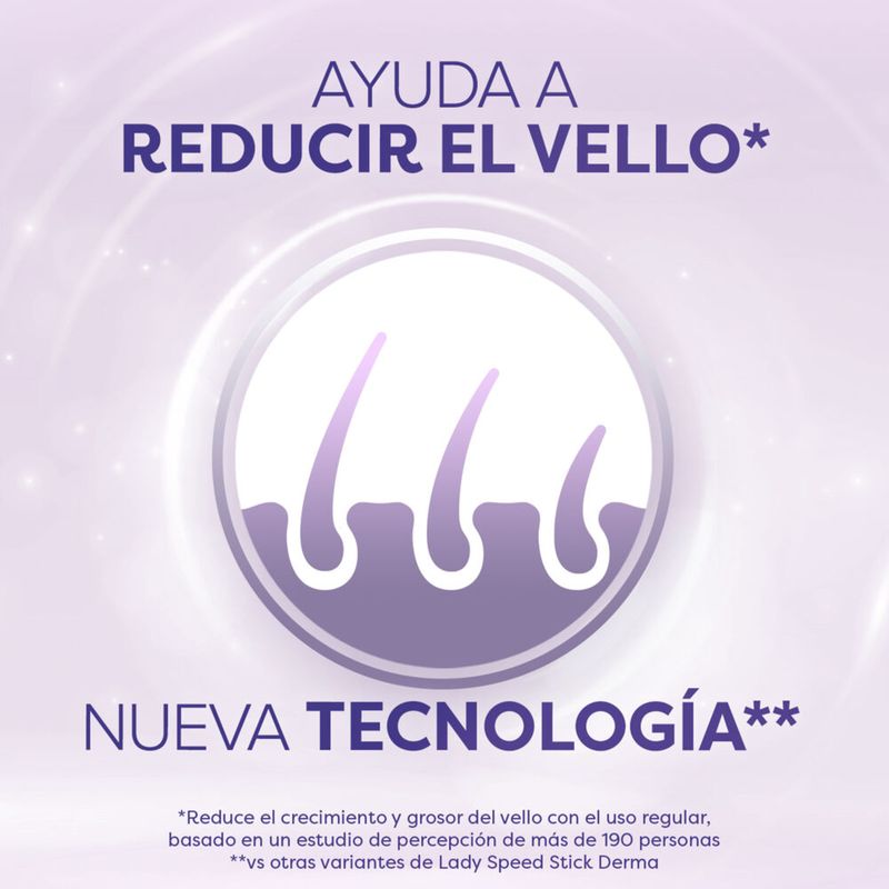 El desodorante antitranspirante Lady Speed Stick Derma Hair Minimizer ayuda a retrasar y reducir el crecimiento del vello* en las axilas obteniendo más libertad y menos irritación, para un cuidado de la piel efectivo. Este desodorante antitranspirante para mujer en crema tiene 0% alcohol**, su nueva tecnología***, clínicamente probada, te brinda 48H de protección contra el sudor y mal olor en las axilas. Mejora tu experiencia de rasurado con el desodorante antitranspirante Lady Speed Stick Derma Hair Minimizer que es suave con tu piel**** y deja una exquisita fragancia infusionada con extracto de manzanilla. *Reduce el crecimiento y grosor del vello con el uso regular, basado en un estudio de percepción de más de 190 personas ** No contiene alcohol etílico ***vs otras variantes de Lady Speed Stick Derma ****Basado en un estudio de percepción de más de 180 personas