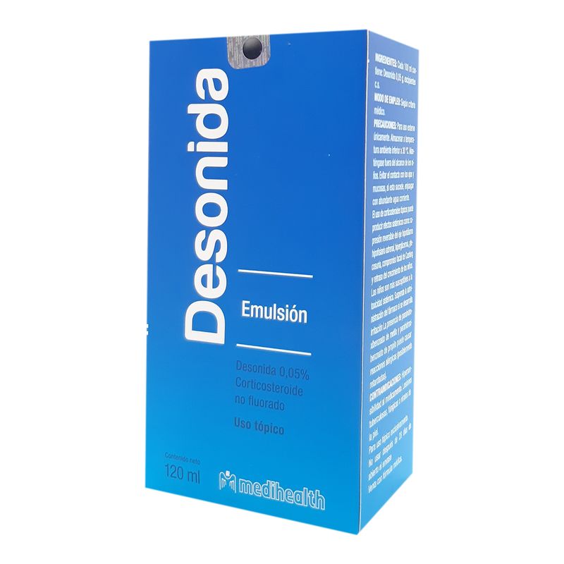 Desonida 0.05% Frasco X 120 Ml Emulsion Megalabs. Este producto es un medicamento, no exceder su consumo. Leer indicaciones y contraindicaciones, si los síntomas persisten consultar al médico.