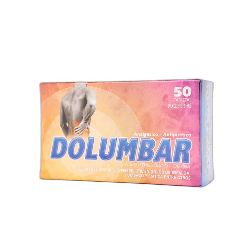 Dolumbar Naproxeno Cafeína 220 Mg/50 Mg Caja X 50 Tabletas Incobra. Este producto es un medicamento, no exceder su consumo. Leer indicaciones y contraindicaciones, si los síntomas persisten consultar al médico. Venta bajo fórmula médica.