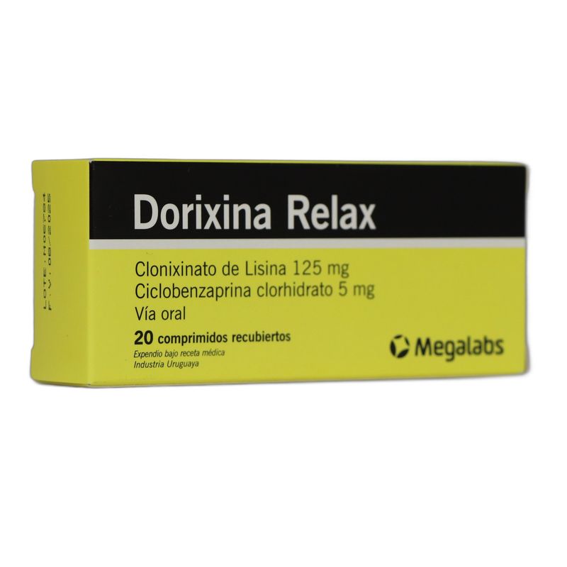 Dorixina Relax Ciclobenzaprina Clorhidrato 5 Mg Clonixinato Lisina 125 Mg Caja X 20 Comprimidos Megalabs. Este producto es un medicamento, no exceder su consumo. Leer indicaciones y contraindicaciones, si los síntomas persisten consultar al médico. Venta bajo fórmula médica.