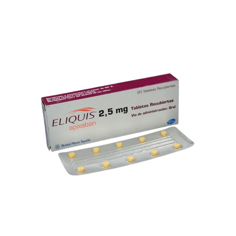 Eliquis 2.5 Mg Caja X 20 Tabletas Pfizer Eliquis está formulado como un anticoagulante. Cada tableta contiene 2.5 mg de apixabán, un inhibidor del factor Xa utilizado para prevenir la formación de coágulos sanguíneos en pacientes con ciertas condiciones médicas. Su presentación en caja de 20 tabletas requiere prescripción médica.