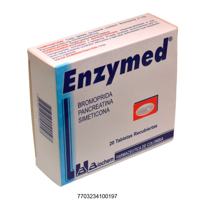 Enzymed Bromoprida Dimetilpolisiloxano Pancreatina en caja de 20 tabletas. Su fórmula ayuda a que tu sistema digestivo funcione de manera más eficiente, reduciendo la sensación de pesadez y gases después de las comidas.