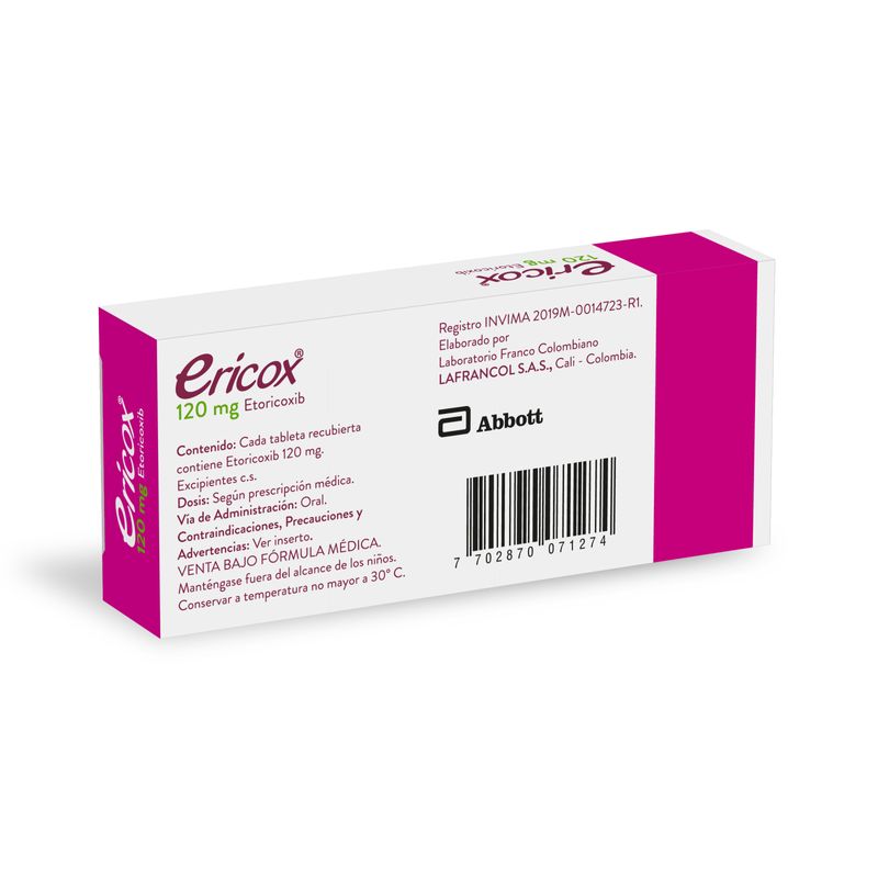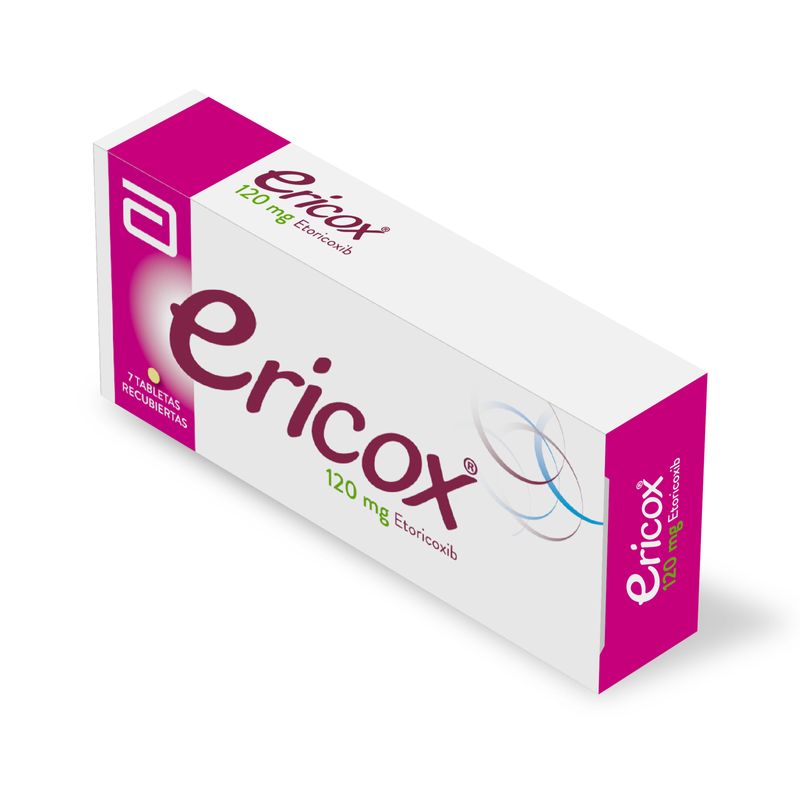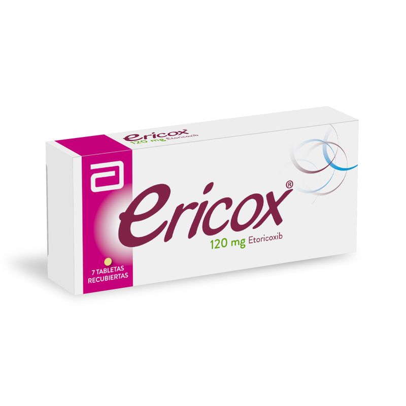 Ericox Etoricoxib 120 Mg Caja X 7 Tabletas Lafrancol. Este producto es un medicamento, no exceder su consumo. Leer indicaciones y contraindicaciones, si los síntomas persisten consultar al médico. Venta bajo fórmula médica.