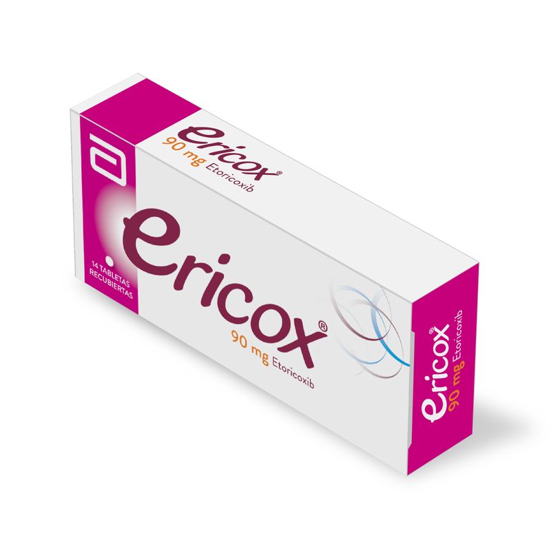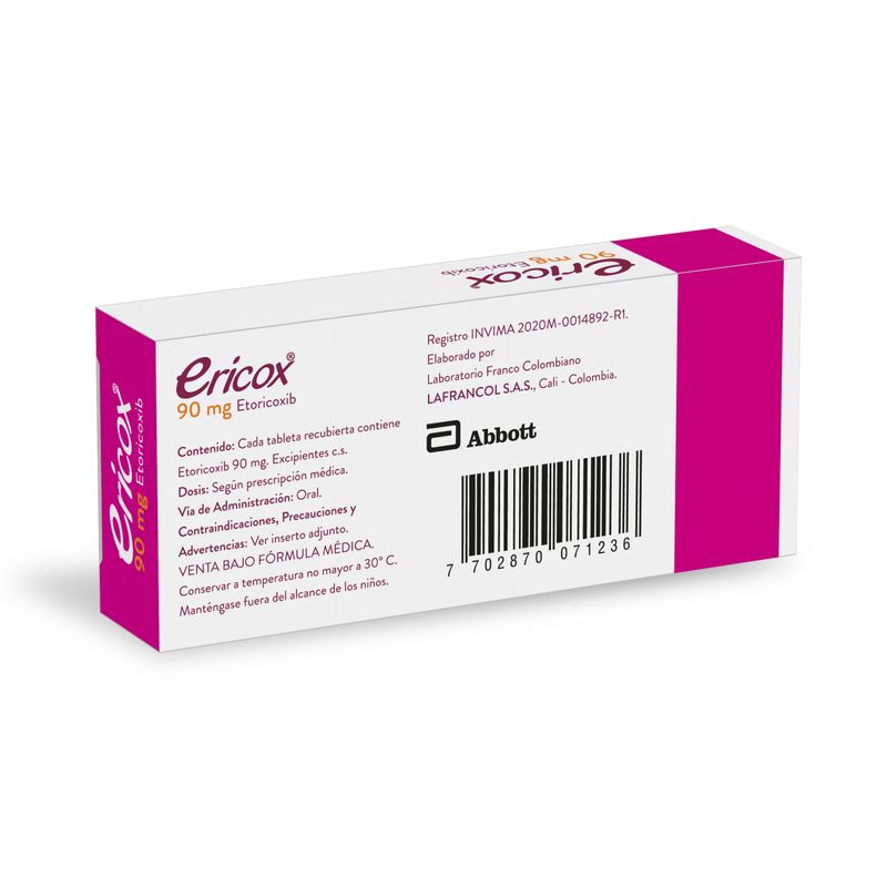 Ericox Etoricoxib 90 Mg Caja X 14 Tabletas Lafrancol. Este producto es un medicamento, no exceder su consumo. Leer indicaciones y contraindicaciones, si los síntomas persisten consultar al médico. Venta bajo fórmula médica.