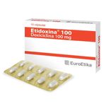 Etidoxina Doxiciclina 100 mg es un medicamento de Euroetika presentado en una caja con 10 cápsulas, diseñado para el tratamiento de diversas infecciones bacterianas. La doxiciclina es un antibiótico de amplio espectro que actúa combatiendo el crecimiento de bacterias en el organismo. Es importante usarlo bajo prescripción médica para asegurar un tratamiento adecuado y efectivo.