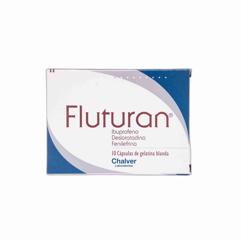 Fluturan Desloratadina 2.5 Mg Fenilefrina Clorhidrato 10 Mg Ibuprofeno 400 Mg Caja X 10 Cápsulas Chalver. Este producto es un medicamento, no exceder su consumo. Leer indicaciones y contraindicaciones, si los síntomas persisten consultar al médico.