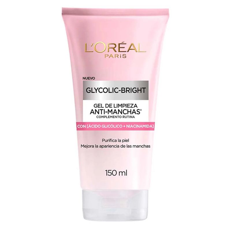 Gel Limpiador Facial Glycolic Bright Antimanchas X 150ml El Gel Limpiador Facial Glycolic Bright Antimanchas de L’Oréal está formulado para limpiar la piel del rostro y ayudar a reducir visiblemente las manchas oscuras y a unificar el tono. Su fórmula contiene ácido glicólico, conocido por sus propiedades exfoliantes y aclarantes. Su presentación de 150 ml es ideal para el uso diario.