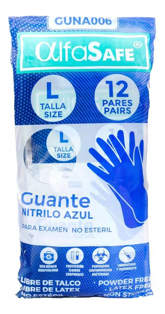 Guante Nitrilo P/Examen Azul L Paquete X 12 Pares Alfa Guantes de nitrilo para examen, talla L, color azul. Paquete de 12 pares marca Alfa. Ideales para protección en diversos procedimientos médicos y de manipulación.