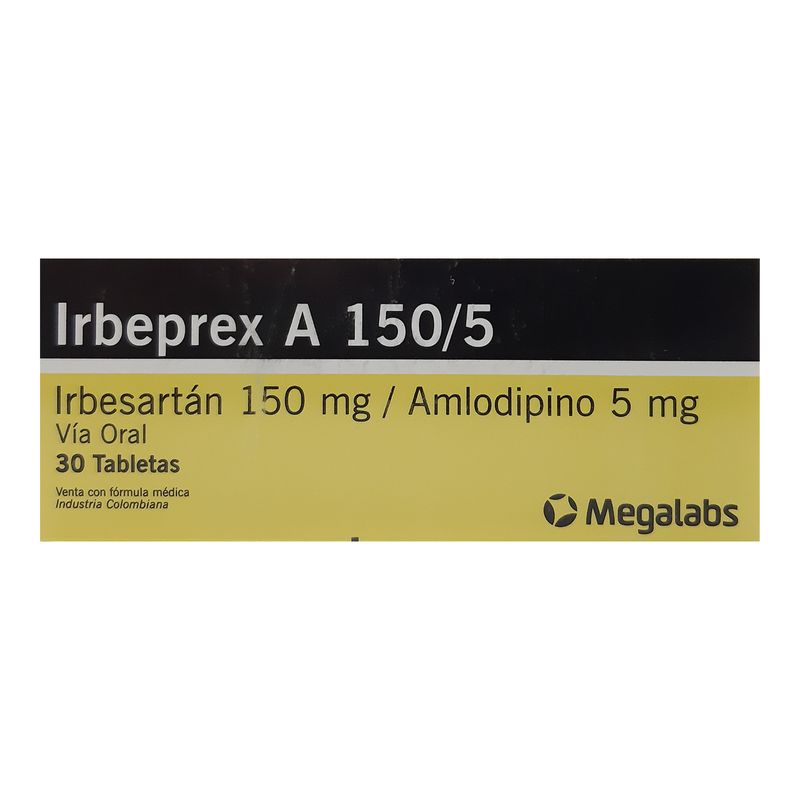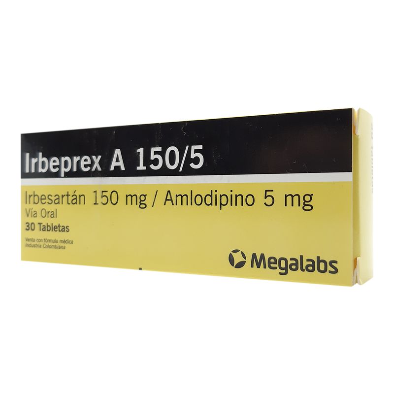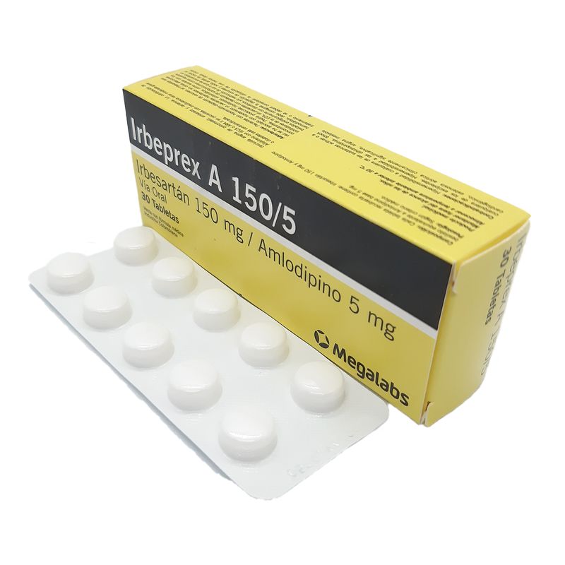 Irbeprex A Irbesartan 150 Mg Amlodipino 5 Mg Caja X 30 Tabletas Megalabs. Este producto es un medicamento, no exceder su consumo. Leer indicaciones y contraindicaciones, si los síntomas persisten consultar al médico. Venta bajo fórmula médica.