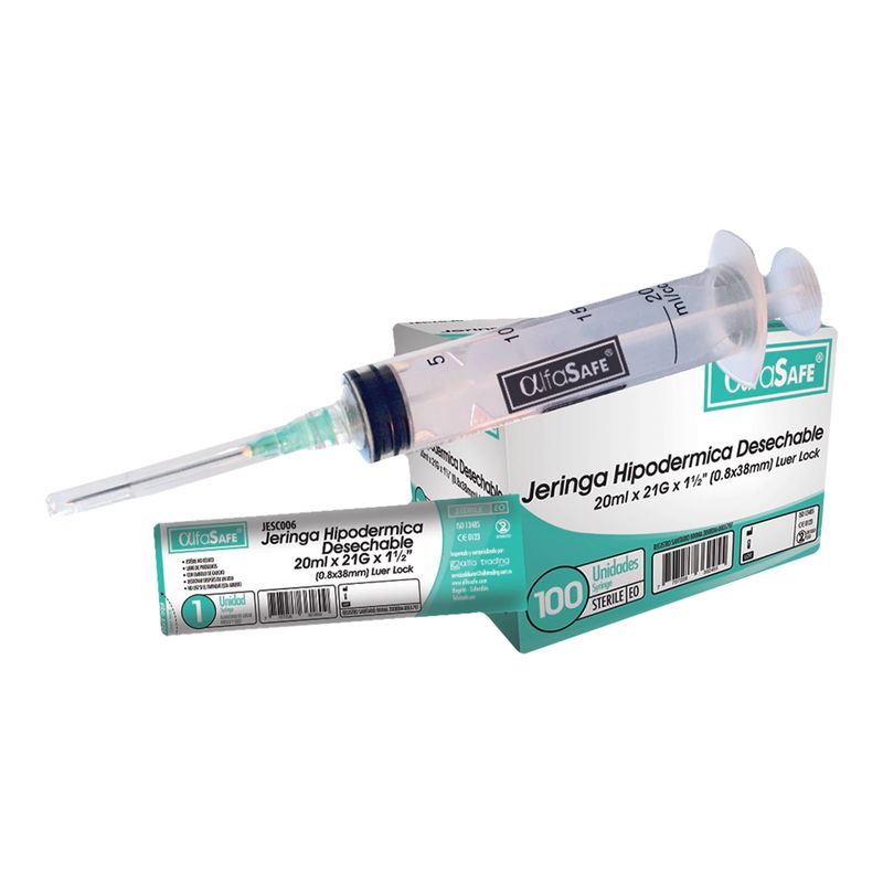 La Jeringa de 20 ml, con aguja 21G x 1 1/2" de Alfa, presentada en unidad individual, es un dispositivo de mayor volumen diseñado para la
