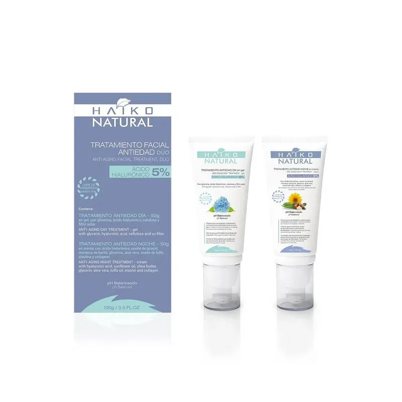 Transforma tu cuidado facial con el Kit Antiedad Día y Noche de Haiko. Este dúo esencial trabaja sin descanso para hidratar, reestructurar y combatir las arrugas, asegurando que tu piel se vea tersa y radiante en todo momento.