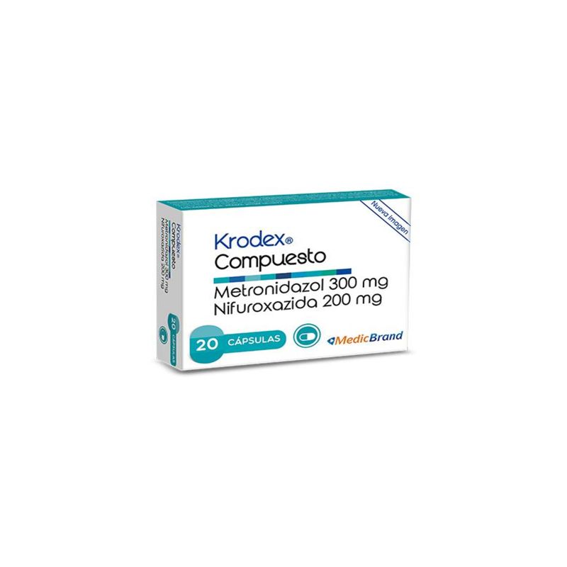 Krodex Compuesto Metronidazol 300 Mg Nifuroxazida 200 Mg Caja X 20 Cápsulas Coaspharma. Este producto es un medicamento, no exceder su consumo. Leer indicaciones y contraindicaciones, si los síntomas persisten consultar al médico. Venta bajo fórmula médica.
