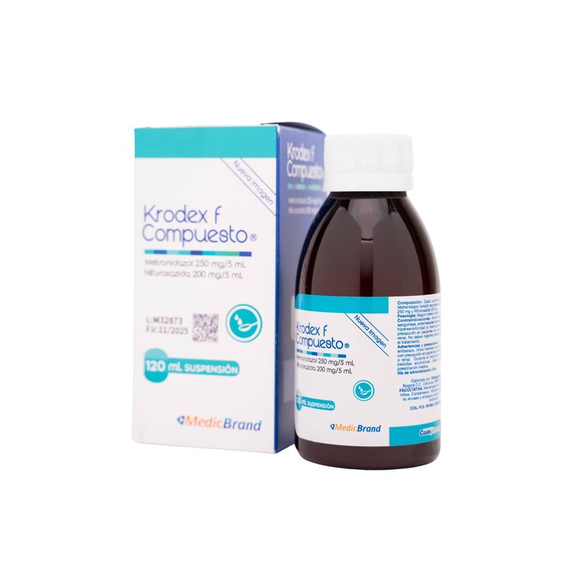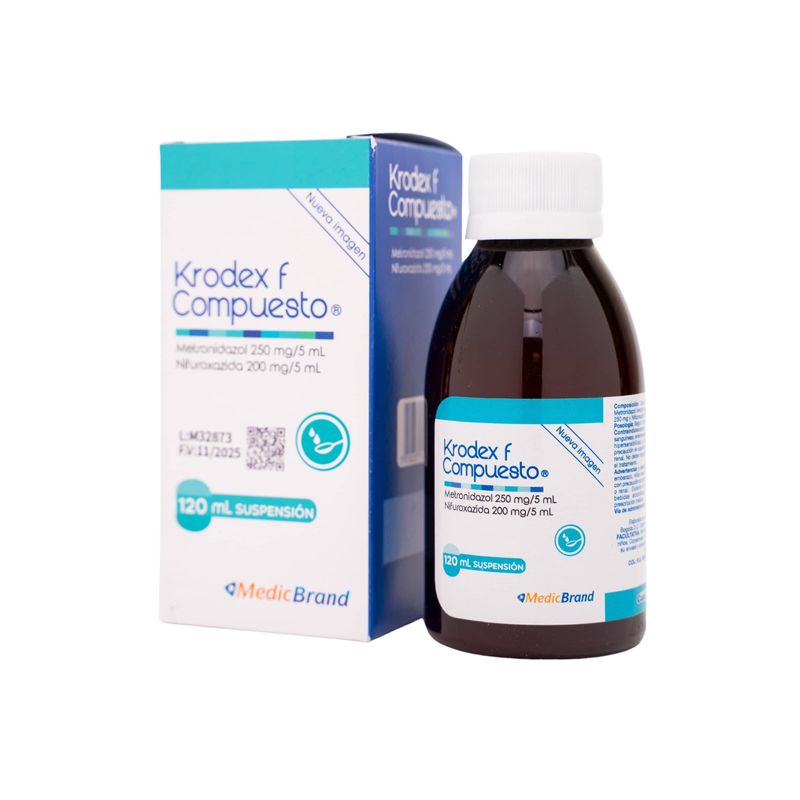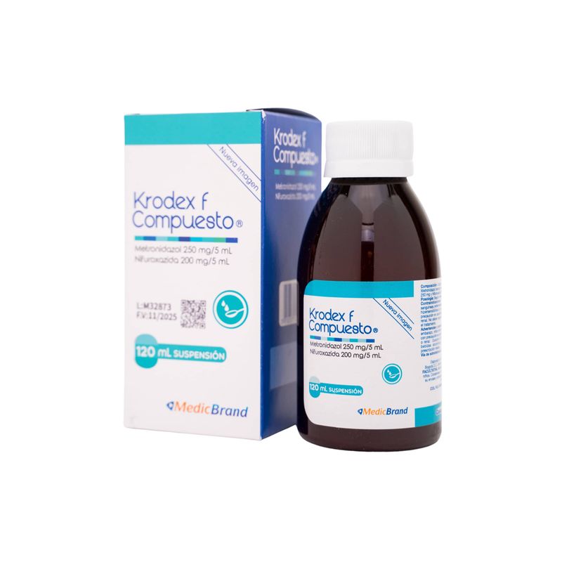 Krodex F Composition Metronidazol 5 Gr Nifuroxazida 4 Gr Frasco X 120 Ml Suspensión Coaspharma. Este producto es un medicamento, no exceder su consumo. Leer indicaciones y contraindicaciones, si los síntomas persisten consultar al médico. Venta bajo fórmula médica.