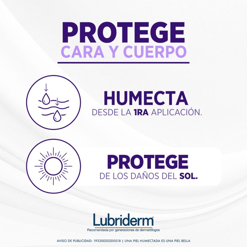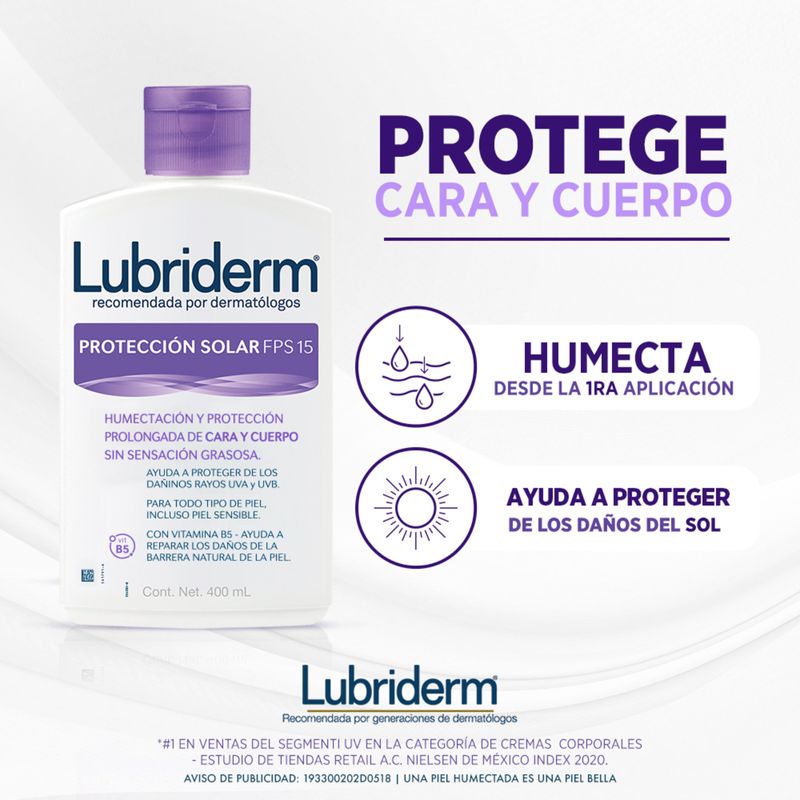 Lubriderm fps 15 es apto para cara y cuerpo ya que no es acnegenico por no favorecer la generación de granos y espinillas, ni comedoenico porque no obstruye los poros de la piel. probado oftalmologicamente, teniendo bajo potencial de irritacion los ojos. clinicamente comprobado por consumidores y evaluado por dermatologos como un producto que no es agresivo para la piel.