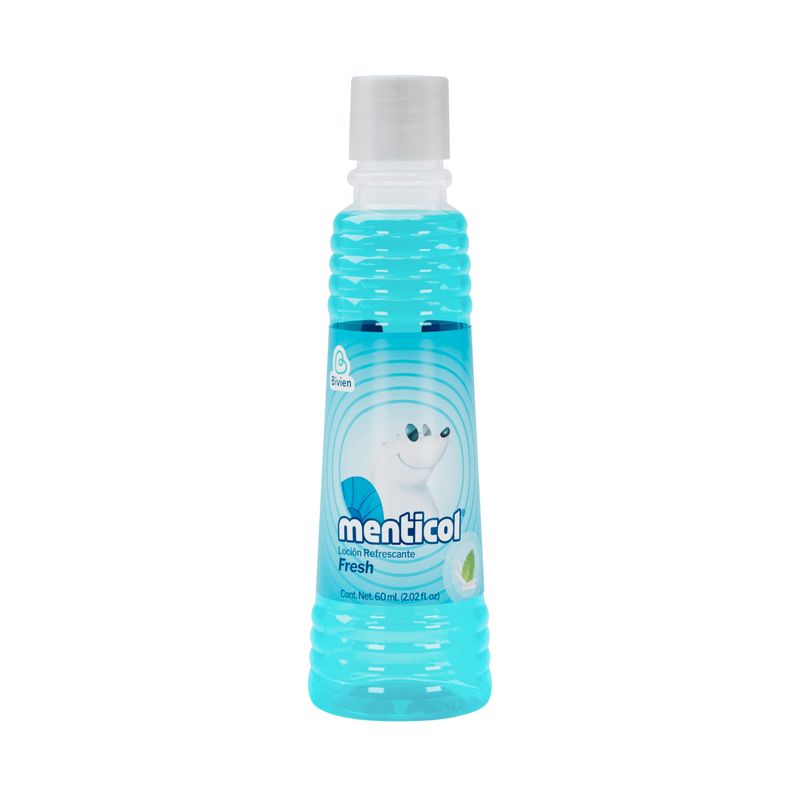 Loción Menticol Fresh en su práctico frasco de 60 ml. Su tamaño compacto es perfecto para el bolso, la mochila o para viajes, asegurando que siempre tengas a mano un toque de frescura instantánea.
