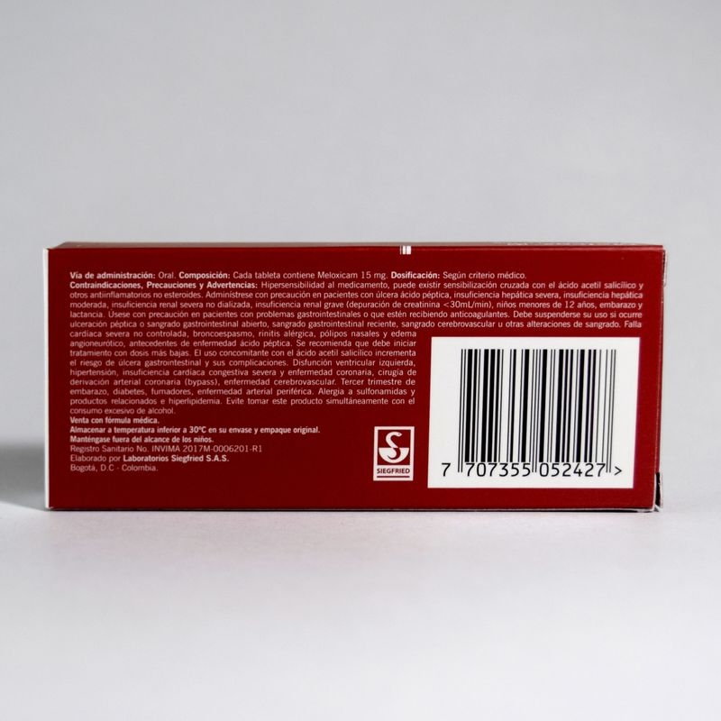 Melcox Meloxicam 15 Mg Caja X 10 Tabletas Siegfried. Este producto es un medicamento, no exceder su consumo. Leer indicaciones y contraindicaciones, si los síntomas persisten consultar al médico. Venta bajo fórmula médica.